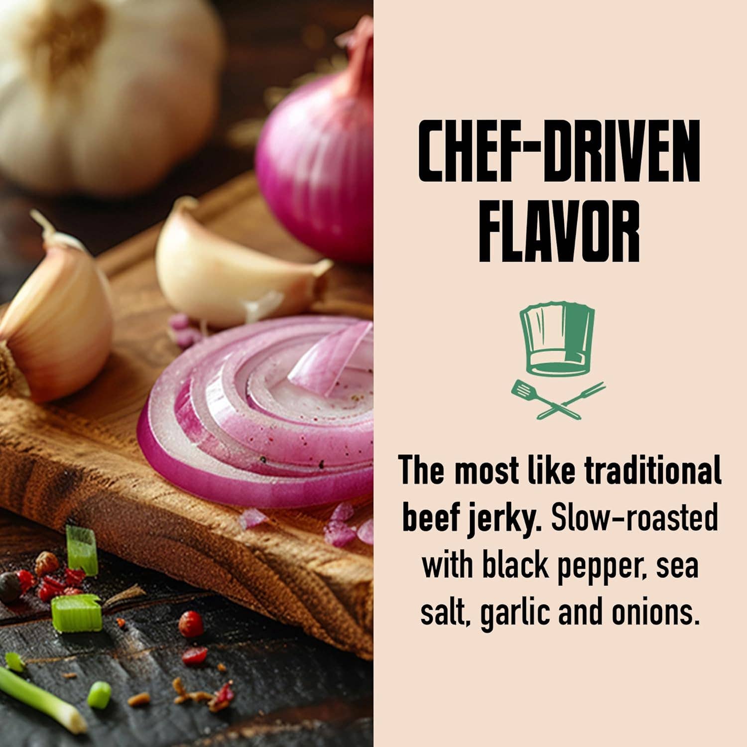 AGRO POWER Jerky Savory Original Flavor- Case of 8 x 2.5oz Bags. Plant-based protein snack with all the protein and taste of meat: - Amazing Taste & Texture - 25g Lean Plant Protein per Bag (as much as the best meat snacks!) - 40% Less Sodium than leading Beef Jerky - None of the Cholesterol, Saturated Fat, or other issues of meat - Slow-roasted with black pepper, sea salt, onions, and garlic. - Project Non-GMO certified and 1% for the Planet Member