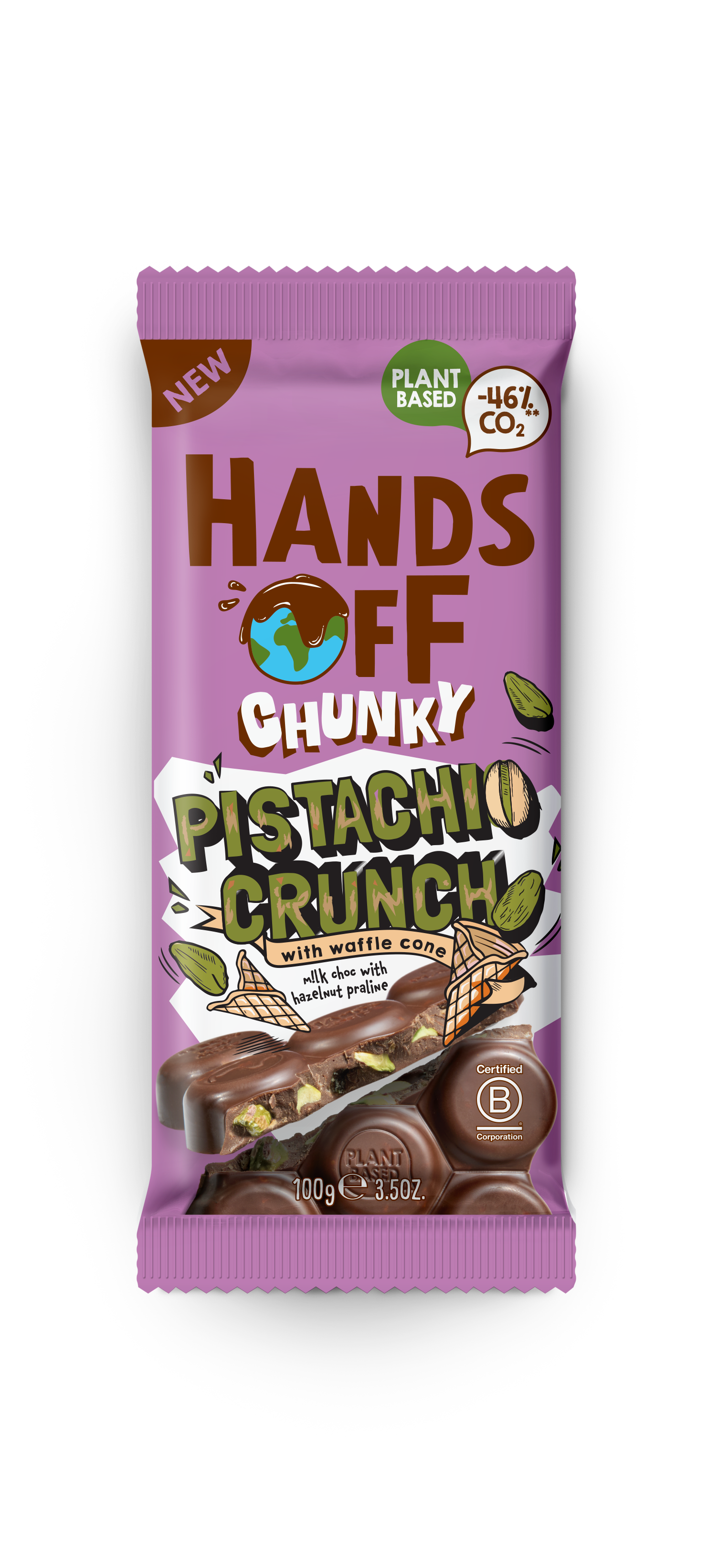 Hands Off Chunky Pistachio Crunch, 3.5 oz. A dynamite Chocolate bar for Pistachio lovers: creamy m!lk chocolate with hazelnut praline, pieces of pistachio nuts and chunks of waffle cookies. 😋 ingredients: sugar, cocoa butter*, cocoa mass*, hazelnut praline (HAZELNUT, sugar, emulsifier: lecithin (SOY)), sunflower kernel powder, PISTACHIO, waffle cone pieces (WHEAT flour, sugar, coconut oil, emulsifier: lecithin (SOY)), emulsifier: lecithin, salt, natural vanilla flavoring. Cocoa solids: 51% minimum. *Rainforest Alliance Certified. Find out more at ra.org