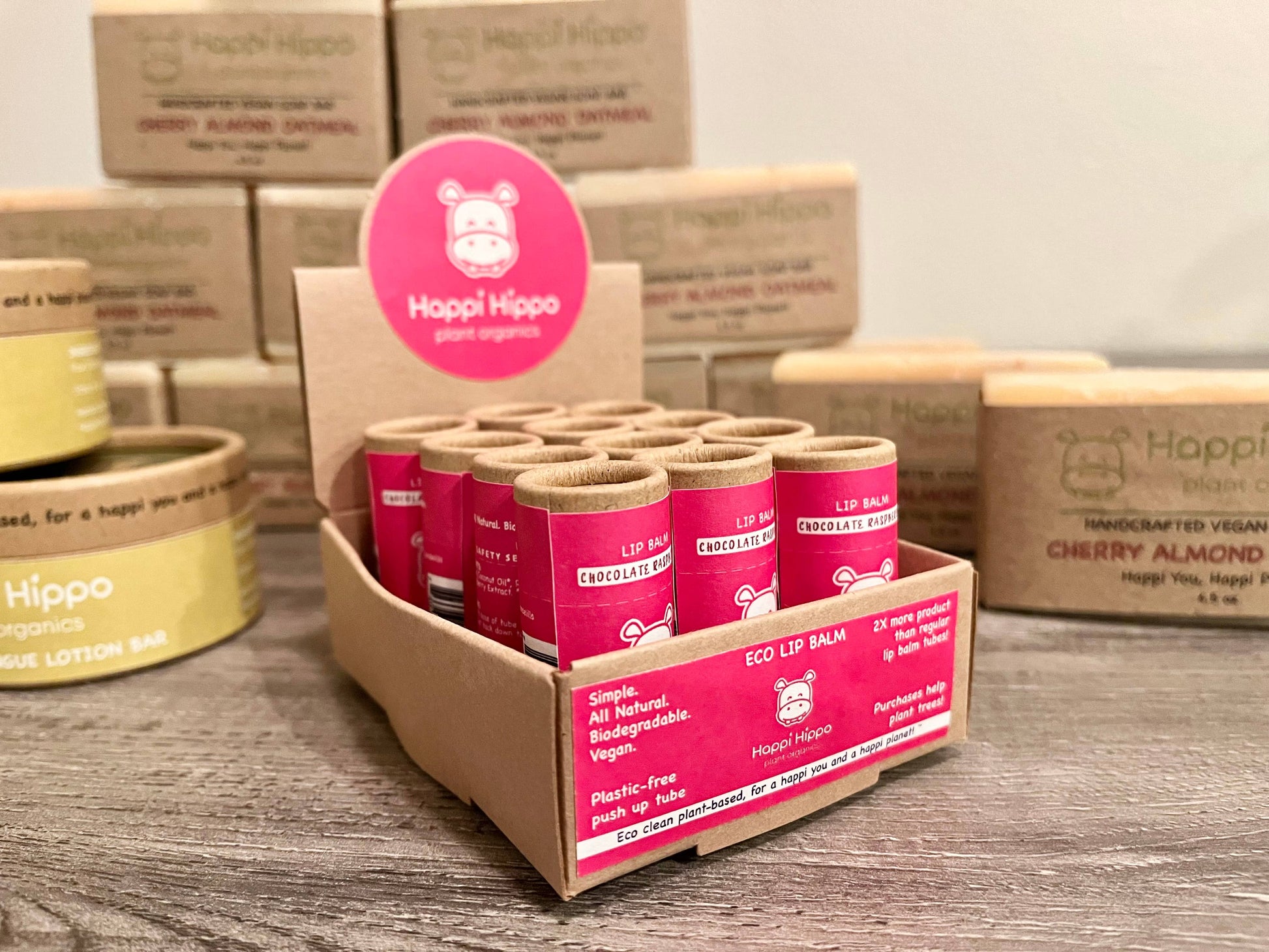 Our vegan balms are eco friendly, plant-based, 100% biodegradable, organic and all natural! We use sustainable and high quality ingredients. We do not use any artificial flavors. Our lip balms are hand-crafted in small batches and come in a display case of 12 lip balms.