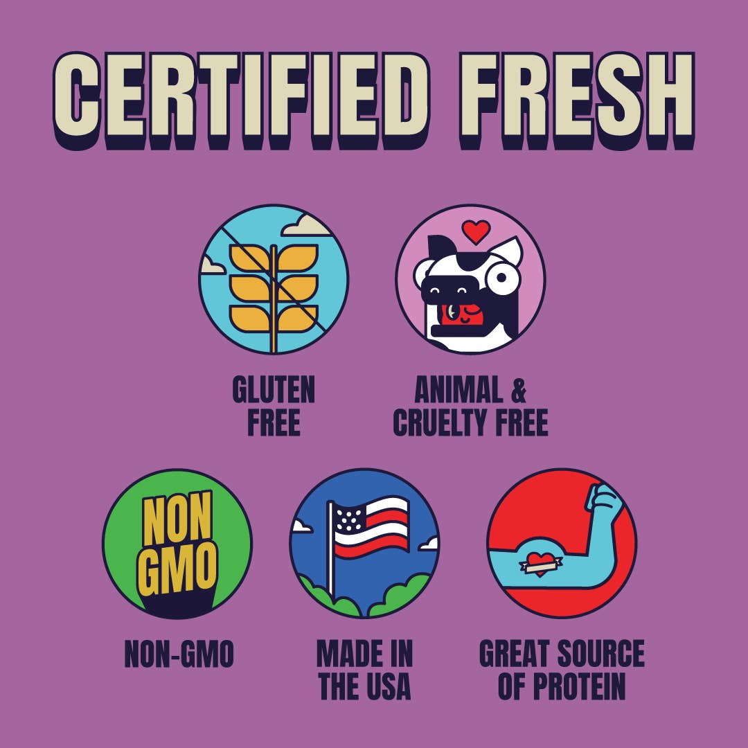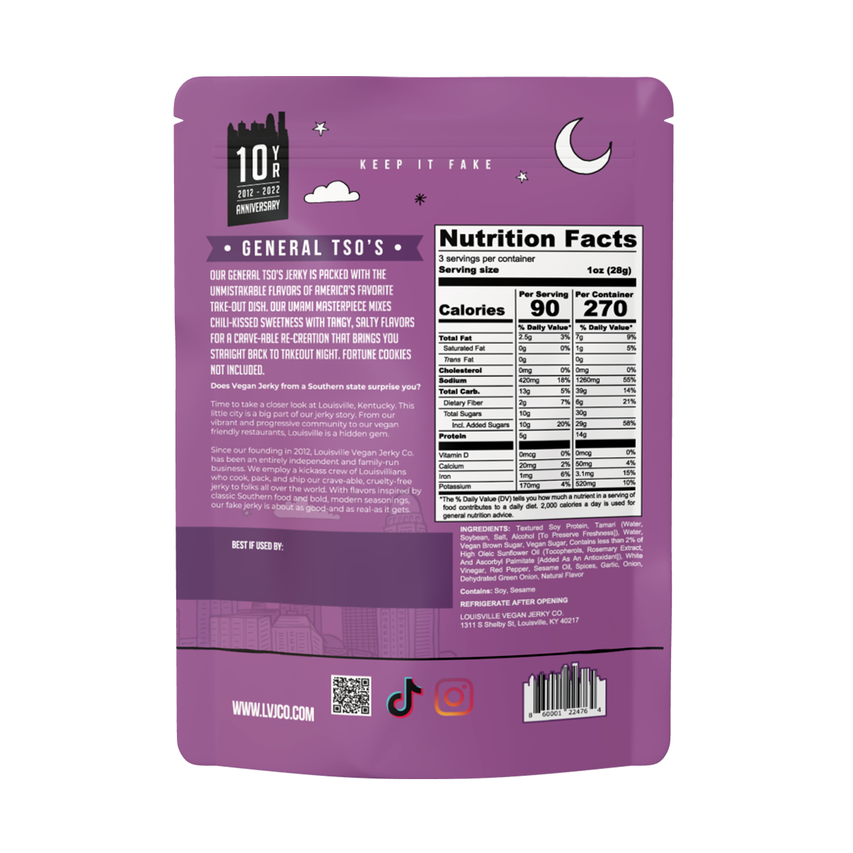 🌶️ Plant-Based | Sweet + Tangy Flavor | High-Protein Our NEW General Tso’s Jerky is packed with the unmistakable flavors of America’s favorite take-out dish. Our umami masterpiece mixes chili-kissed sweetness with tangy, salty flavors for a crave-able re-creation that brings you straight back to take-out night. Fortune cookies not included. - Free of gluten and cholesterol - 80 Calories/ 4 grams of protein per serving - 250 Calories/ 13 grams of protein per bag - Certified Gluten Free, Non-GMO Verified, Certified Vegan, Made in the USA. Perfect for travel snacks, back to school, and anyone looking for a satisfying, high-protein, plant-based snack!