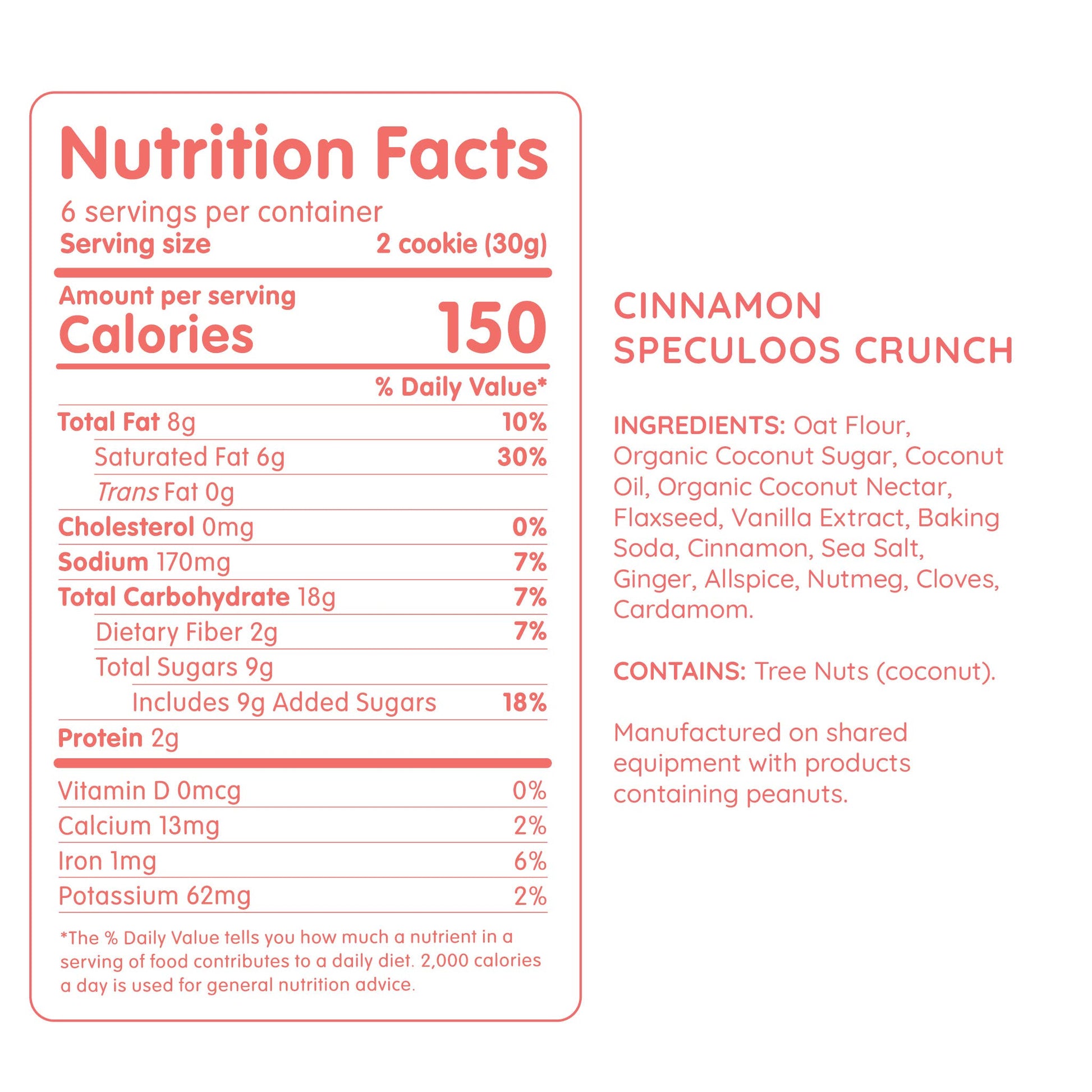 CRISP & COZY. This delicate, buttery cookie has notes of brown sugar and all your favorite spices: cinnamon, nutmeg, cloves, and cardamom. SWEETENED BY NATURE. We sweeten with coconut sugar TASTES HOMEMADE. Our cookies hold true to mom’s homemade cookie experience. BETTER-FOR-YOU. No empty calories! Just nutrient-rich ingredients like whole-grain oats. MADE FOR MORE TO ENJOY. Low sugar and certified gluten free, vegan, kosher, and non-GMO.
