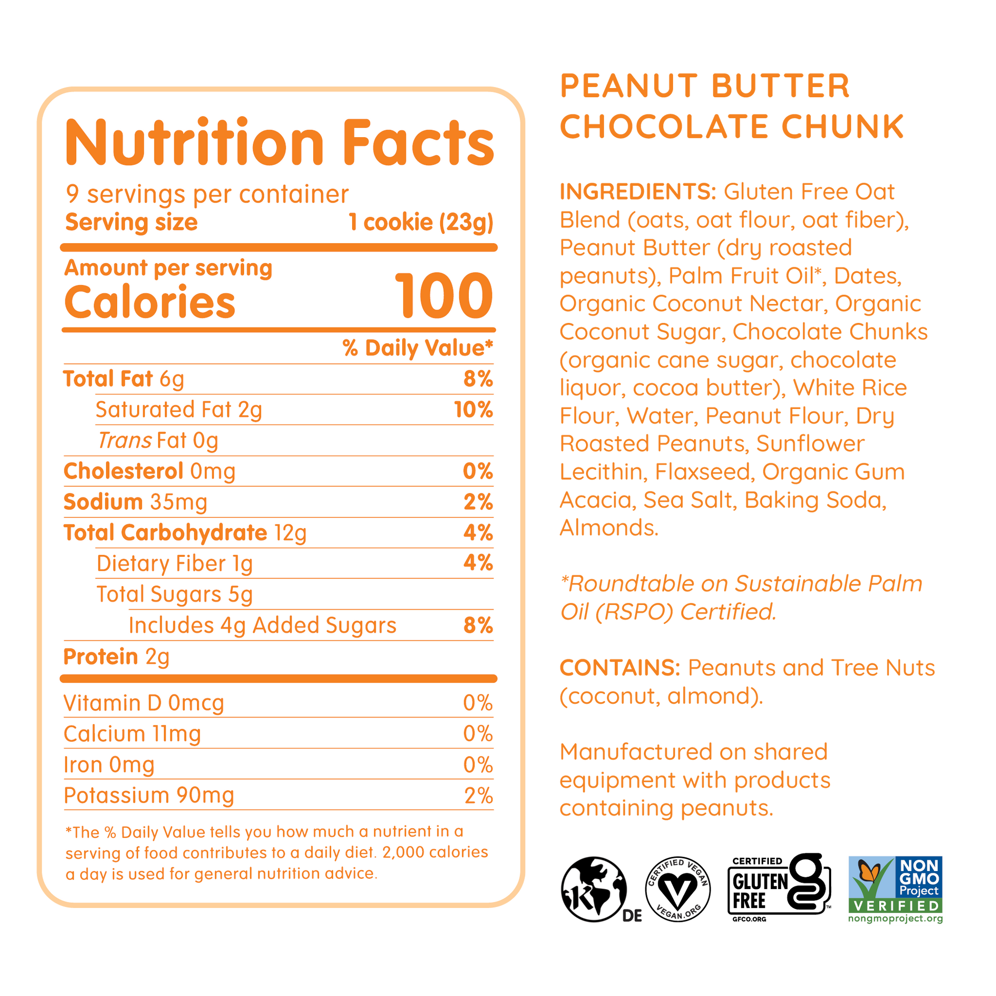 We make these soft, rich, decadent cookies with peanut butter AND peanuts AND giant chocolate chunks. Tastes like a peanut butter cup that’s all grown up. SWEETENED BY NATURE. We sweeten with coconut sugar and dates! TASTES HOMEMADE. Our cookies hold true to mom’s homemade cookie experience. BETTER-FOR-YOU. No empty calories! Just nutrient-rich ingredients like whole-grain oats. MADE FOR MORE TO ENJOY. Low sugar and certified gluten free, vegan, kosher, and non-GMO.