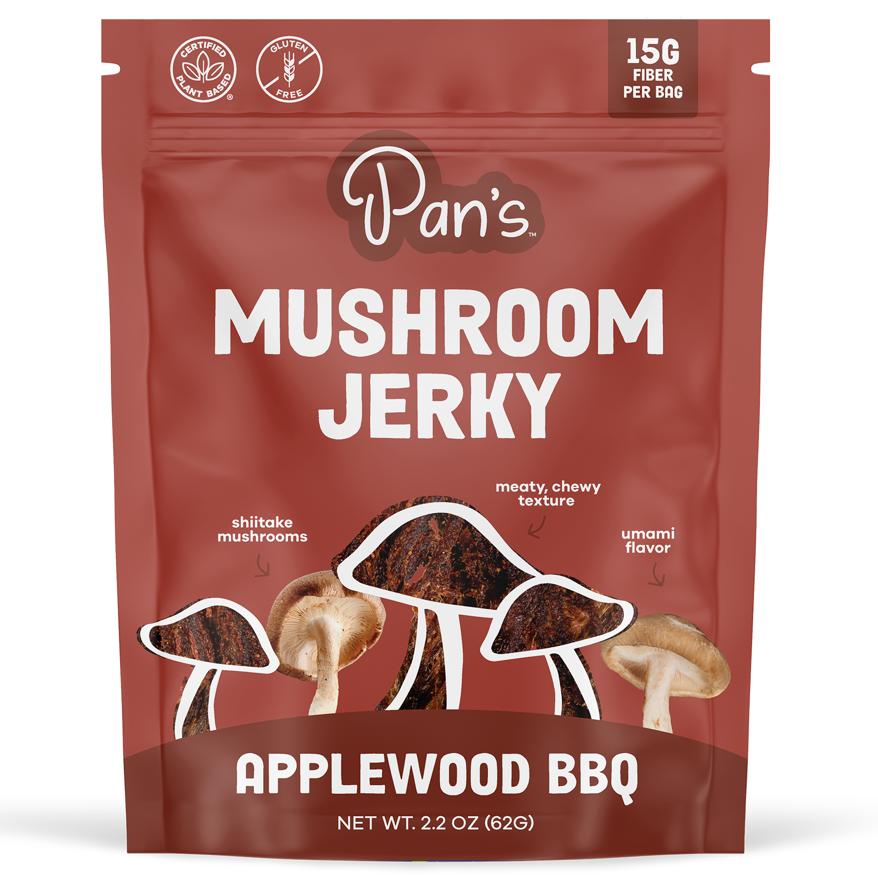 Pan's Mushroom Jerky is a shiitake mushroom snack with a delicious umami flavor and satisfying chewy texture. Pan's is plant-based, vegan, high in fiber, kosher, soy-free, gluten-free, and made with simple ingredients.