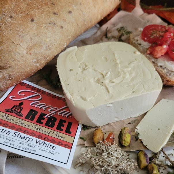 A very sharp white cheddar, yummy as mac n' cheese! Non-gmo tofu, coconut oil, salt, agar, vegan lactic, nutritional yeast, garlic, onion, vinegar, miso.