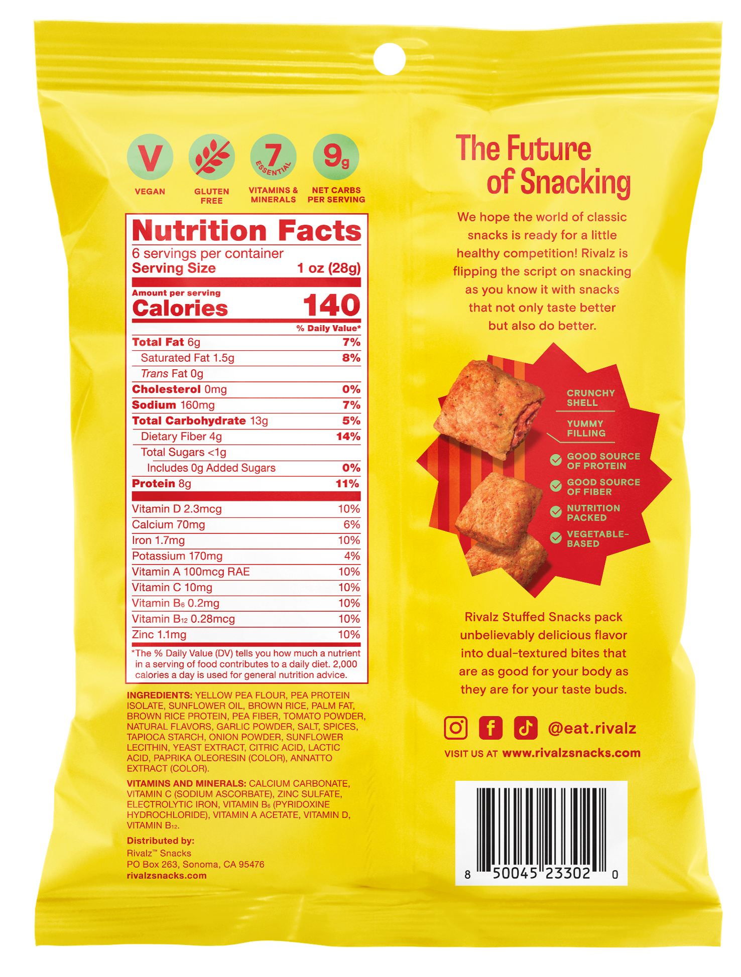 You won't believe your taste buds! Crunchy, vegetable-based shell, stuffed with that familiar pizza flavor you know and love. We’re giving your favorite pizza flavored snack a little healthy competition with a lot more protein, fiber, nutrients, and vitamins and minerals!