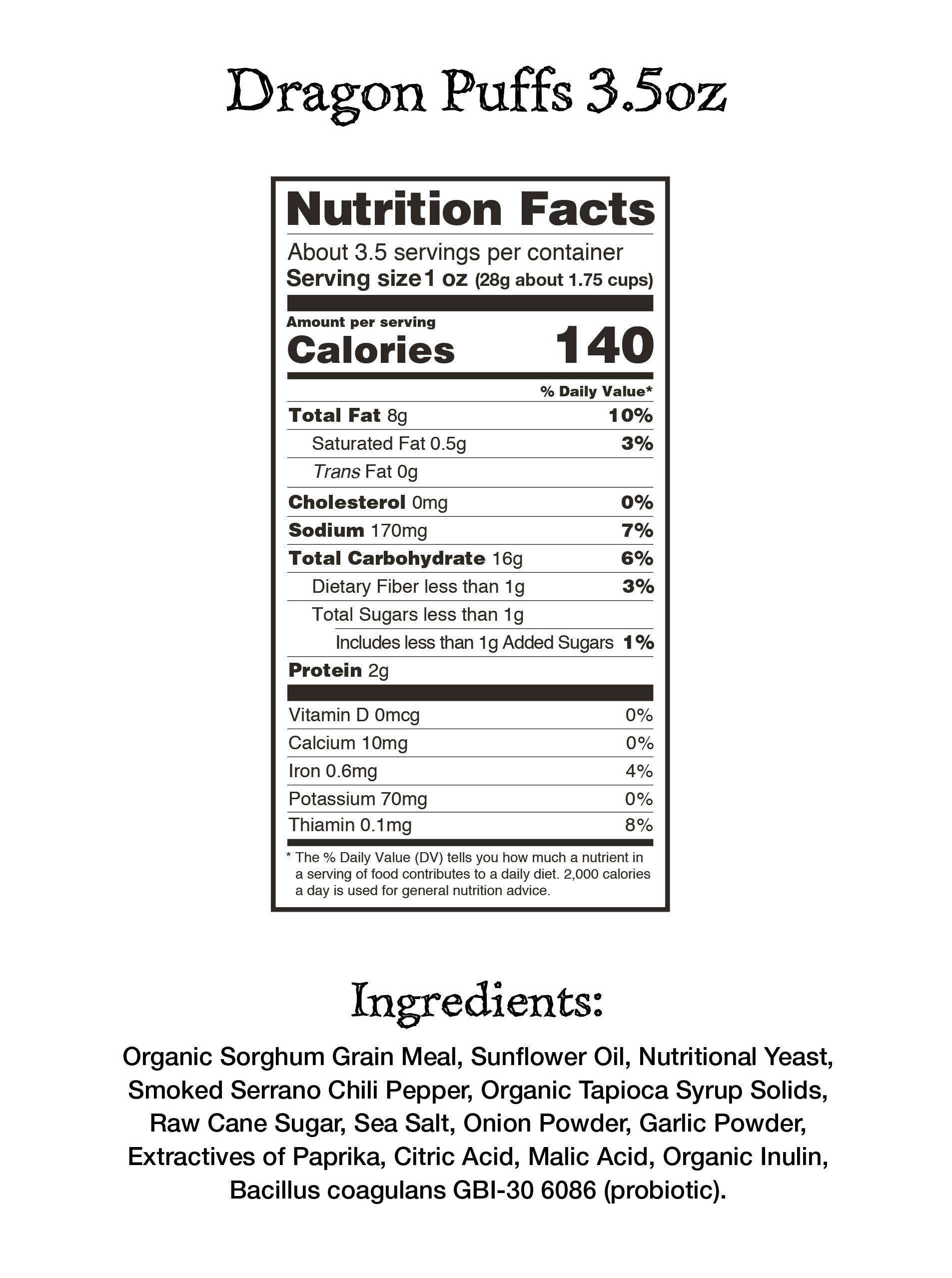 Our Spicy Dragon puffs are the perfect alternative to the modern spicy snack! These addictive puffs bring tons of fire and flavor! Available in both 3.5oz share-size. Vegan Rob’s® Dragon Puffs are so delicious, they will change your life forever! These puffs are made with the finest ingredients including serrano peppers from Mexico. They go from smoky, to spicy, then cool and satisfy that spicy and crunchy desire to feed your inner soul. You're going to wonder how it all happened! Vegan Rob’s® puffs are made with organic sorghum, an environmentally friendly, drought-resistant grain that can feed the world. They are good for the environment, and your body, and promote compassion for all living things. We slayed the dragon and brought these to you. The crunch will protect you from the heat of the dragon and the cool will make you want more. Be a part of our amazing journey and thanks for being you.