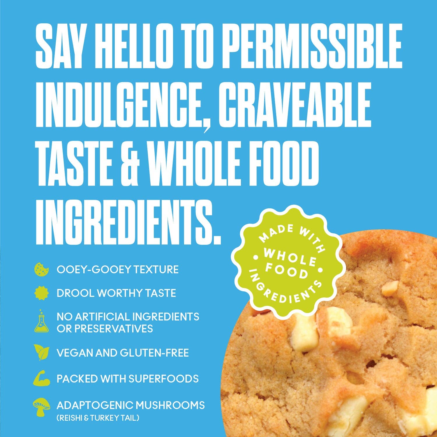 Finally, you can have your cake and eat it too. Gut friendly ingredients, perfectly sweetened vegan white chocolate chips and a moist and chewy cookie base to hold it all together. This cookie is truly a party in your mouth (and your whole body).