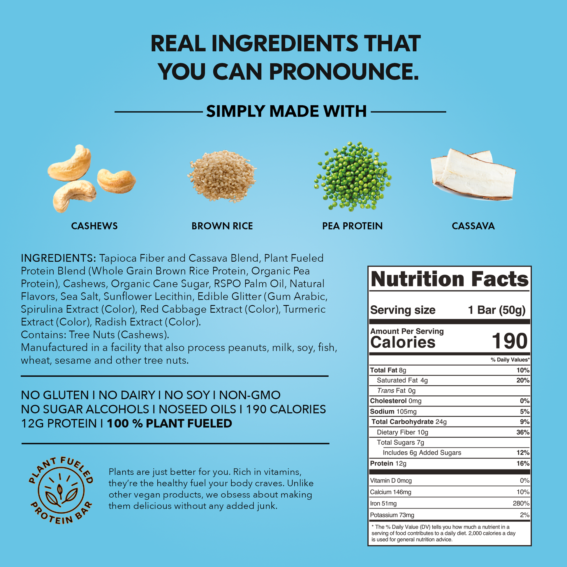 The TRUBAR Sake it, Bake it, Birthday Cake it protein bar is a celebration in every bite—funfetti vibes, real ingredients, and zero guilt. For those who: • Crave that nostalgic birthday cake flavor—sprinkles, vanilla, and all. • Want a feel-good snack that fuels your day without the sugar crash. • Believe you don’t need a special occasion to treat yourself. 190 calories per bar 12g of plant protein. Vegan No Gluten, No Dairy, No Soy, No Sugar Alcohols, No Seed Oils GLP-1 Friendly: Full of protein and fiber, perfect for your GLP-1 needs. Ingredients: Tapioca Fiber and Cassava Blend, Plant Fueled Protein Blend (Whole Grain Brown Rice Protein, Organic Pea Protein), Cashews, Organic Cane Sugar, RSPO Palm Oil, Natural Flavors, Sea Salt, Sunflower Lecithin, Edible Glitter (Gum Arabic, Spirulina Extract [Color], Red Cabbage Extract [Color], Turmeric Extract [Color], Radish Extract [Color]).