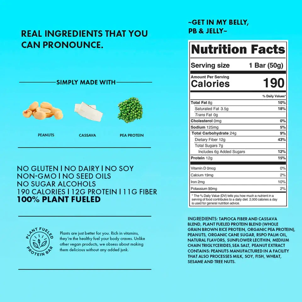 You’ll swear the TRUBAR Get in My Belly PB & Jelly protein bar tastes too good to be healthy, but it’s true! With 12 grams of vegan protein in every bar it will become your go-to source for nutritious plant fueled protein. For those who: · Get the peanut butter + Jelly = #relationshipgoals · Crave healthy treats but can do without bloat-causing sugar alcohols · Know that jelly just gets in the way of that peanutty goodness 190 calories per bar 12g of plant protein. Vegan No Gluten, No Dairy, No Soy, No Sugar Alcohols, No Seed Oils GLP-1 Friendly: Full of protein and fiber, perfect for your GLP-1 needs. Ingredients: Tapioca fiber and cassava blend, plant fueled protein blend (whole grain brown rice protein, organic pea protein), peanuts, organic cane sugar, rspo palm oil, natural flavors, sunflower lecithin, medium chain triglycerides, sea salt, peanut extract. Contains: Peanuts.
