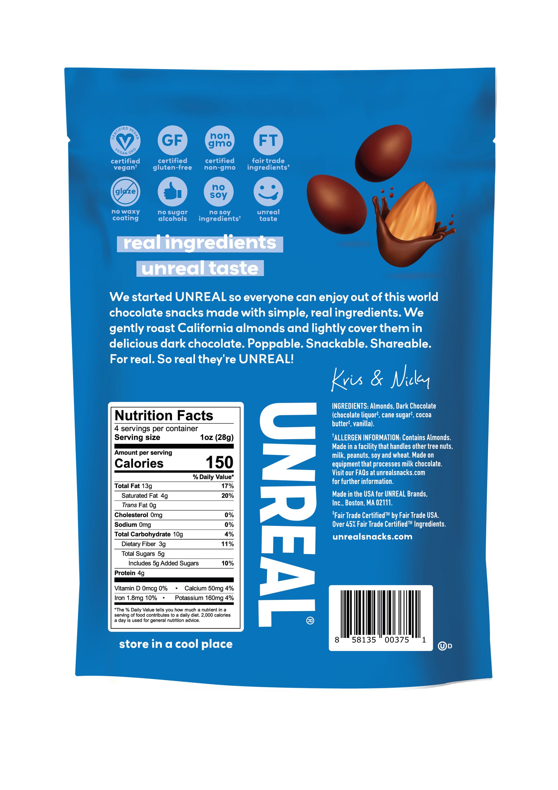 We perfected chocolate snacking and we did it with just two simple ingredients - almonds and chocolate. With our gently roasted California almonds lightly coated in delicious fair trade dark chocolate, you can finally ditch the high sugar content and mile-long ingredient lists. Plus, you don’t have to worry about weird waxy coatings or messy cocoa dust when you’re on-the-go. just poppable, craveable, real-ingredient goodness that feels like a treat and satisfies like a snack.