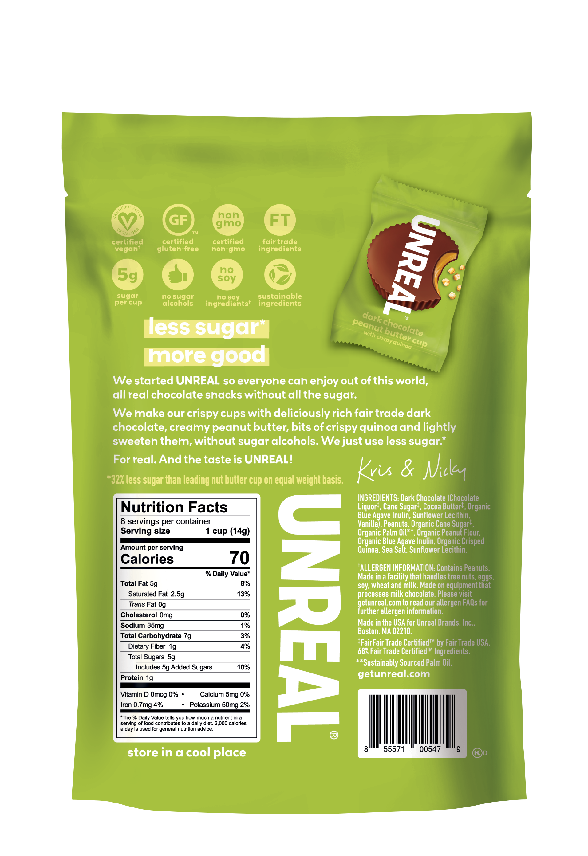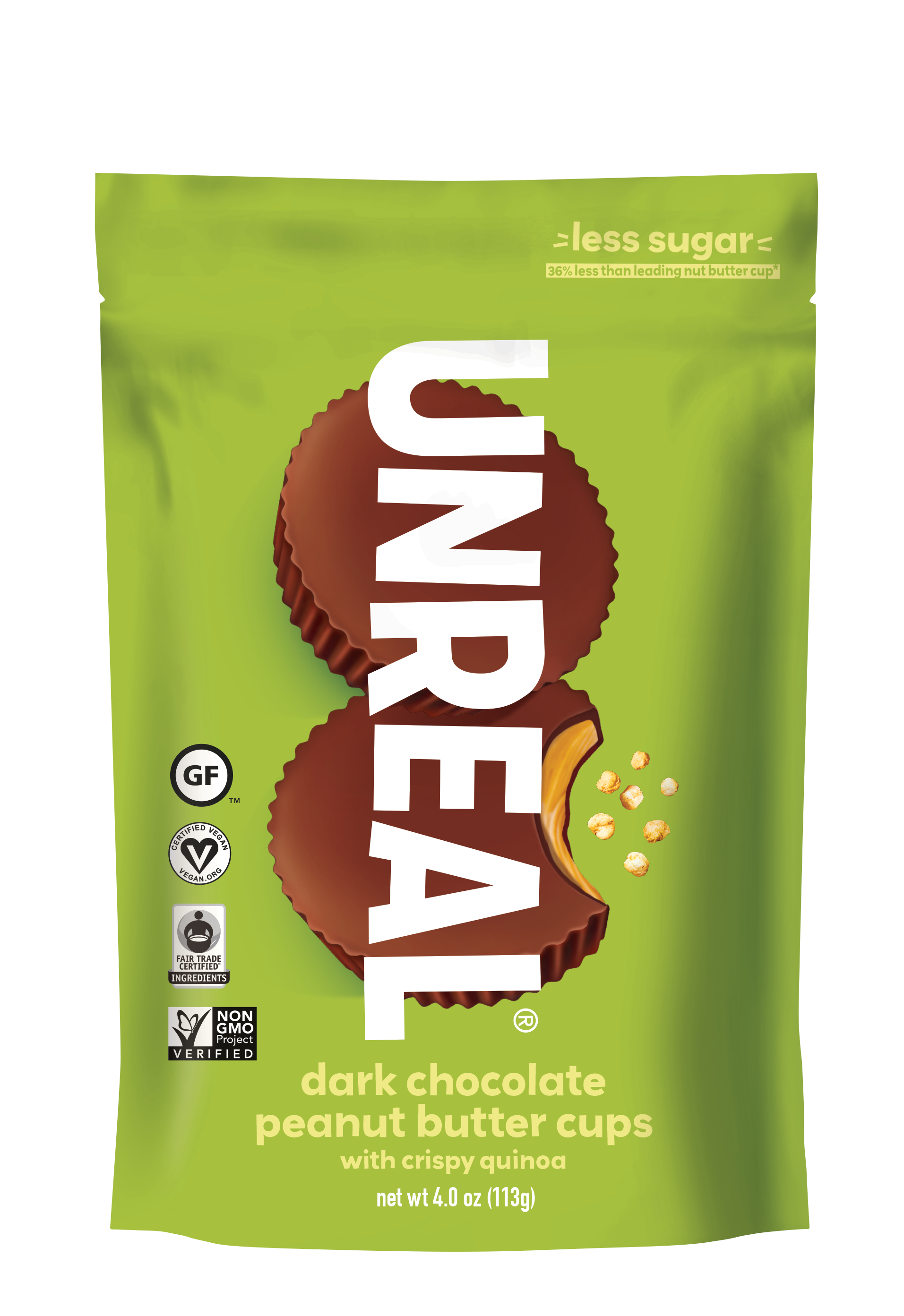 UNREAL is on a mission to build a world where you don't have to be afraid of your food, starting with your favorite indulgent snacks. * ONLY 5G SUGAR: we keep sugar to a minimum, without using sugar alcohols or artificial sweeteners. We carefully formulate our cups with only the best, quality ingredients. * ALL-NATURAL: our cups are non-gmo project verified and made in small batches with fair trade certified ingredients. Our palm oil is RSPO certified sustainable. * ALL-REAL - certified gluten free by GFCO, certified vegan, no dairy ingredients, no soy ingredients, no artificial flavors, no sugar alcohols, no preservatives, and no fillers.